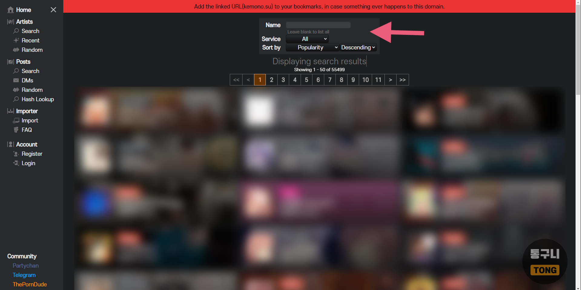 사이트 이용하는 방법은 간단합니다. 좌측 메뉴 목록에서 Artists 탭을 누르고 이름을 입력하고 서비스, 정렬 기준 등의 메뉴를 눌러 목록에서 확인하면 됩니다. 참고로 키워드 검색은 한글이 아닌, 가능한 영어로 입력해야 결과물을 쉽게 찾을 수 있을 겁니다. 검색해도 나오지 않는 자료는 위에 언급했듯이 아직 케모노에 업로드되지 않은 것이니 이용하실 때 참고하시기 바랍니다.